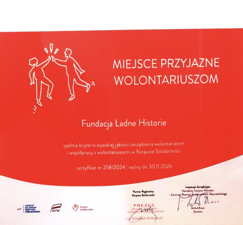 Z radością dzielimy się wspaniałą wiadomością – nasza Fundacja została wyróżniona Certyfikatem „Miejsce Przyjazne Wolontariuszom”!